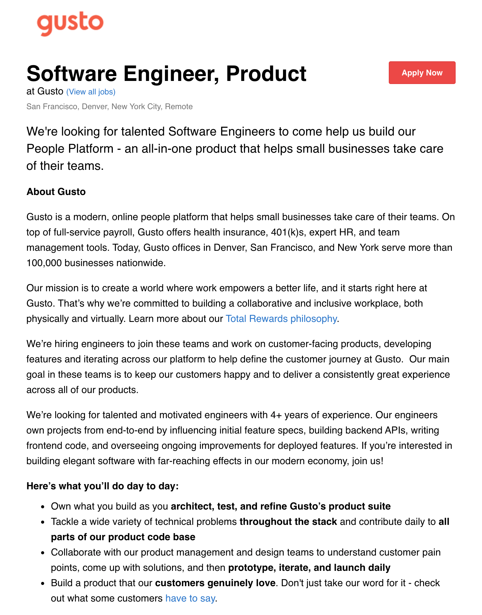 The company I am talking about is Gusto. And here is an extract of their job posting so that we can talk about the elements of this post.